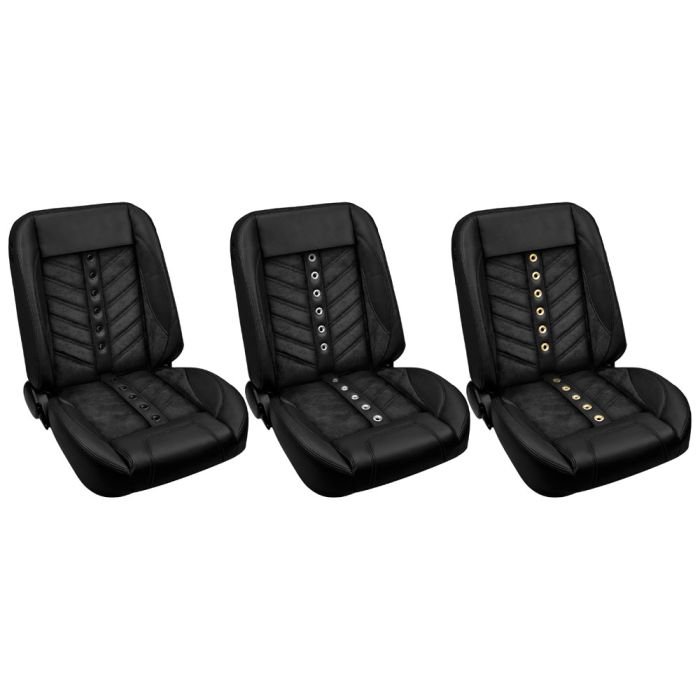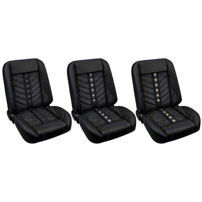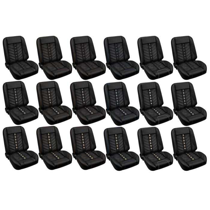 TMI utilizes their unique Sport VXR design for these seats. Manufactured from a premium black vinyl material, each seat comes with a contrast stitching in your choice of color option. You’ll also be able to choose whether you want black, brass or stainless steel grommets on your seats. These grommets will go down the center of each seat back and seat bottom and features the same color as the stitching that is seen behind each grommet.