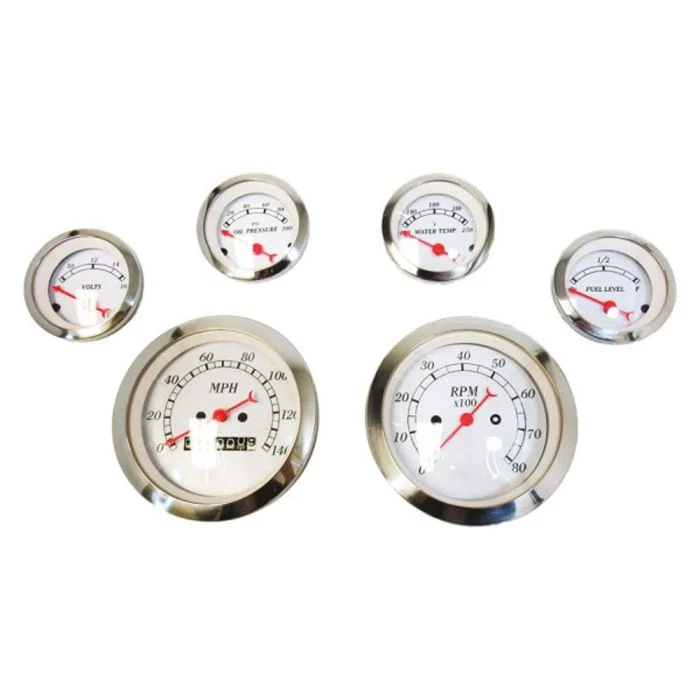 This CJ Classic Trucks 6-Gauge Speedometer Set (S5737) comes with everything you need in one package: a 3-3/8” Speedometer and a Tachometer with 2-1/6” accessory gauges. The gauges feature a vintage style with chrome bezels, orange pointers, and white gauge faces. This set includes a speedometer and a tachometer, plus as volt, oil pressure, water temp, and fuel gauges. These gauges use a mechanical style mile counter and feature all required wiring for installation.
